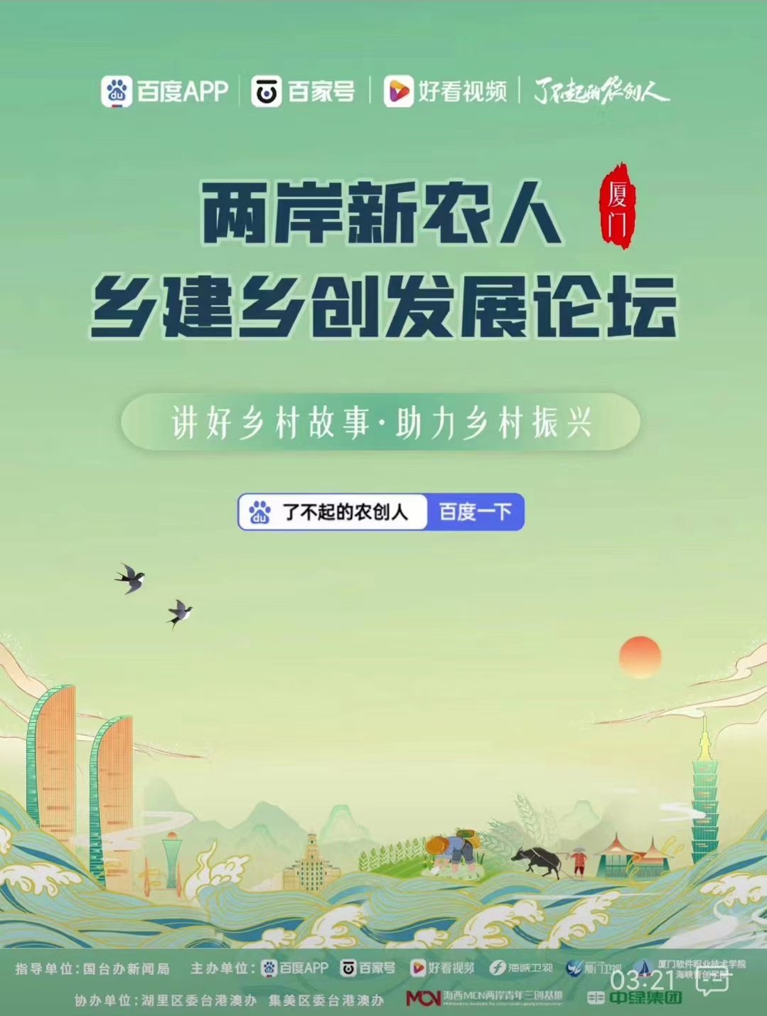 3月22日,由國臺辦新聞局指導,百度百家號、好看視頻、海峽衛(wèi)視、廈門衛(wèi)視、廈門軟件職業(yè)技術學院海峽青創(chuàng)學院主辦,湖里區(qū)委臺港澳辦、集美區(qū)委臺港澳辦、海西MCN兩岸青年三創(chuàng)基地、中綠集團協(xié)辦的「2023兩岸新農(nóng)人鄉(xiāng)建鄉(xiāng)創(chuàng)發(fā)展論壇」 在廈門舉辦。