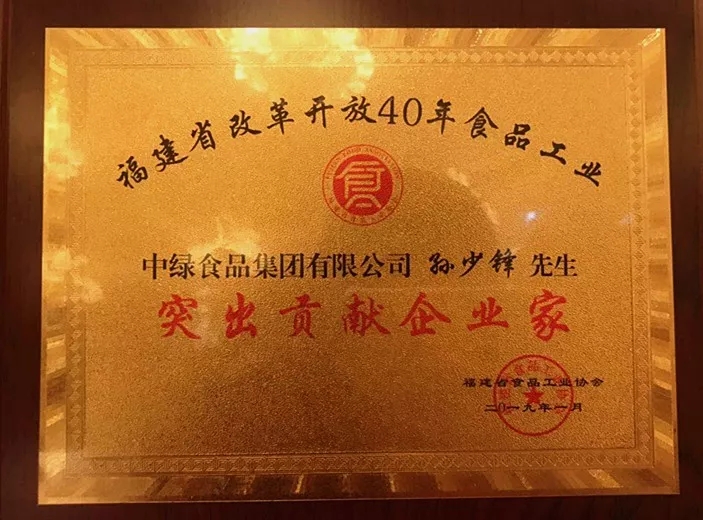2019年1月11日,2018年度福建省食品工業(yè)協(xié)會年會暨表彰大會于福州隆重召開。中綠集團(tuán)創(chuàng)始人孫少鋒先生榮獲福建省改革開放40年“食品工業(yè)突出貢獻(xiàn)企業(yè)家”稱號。